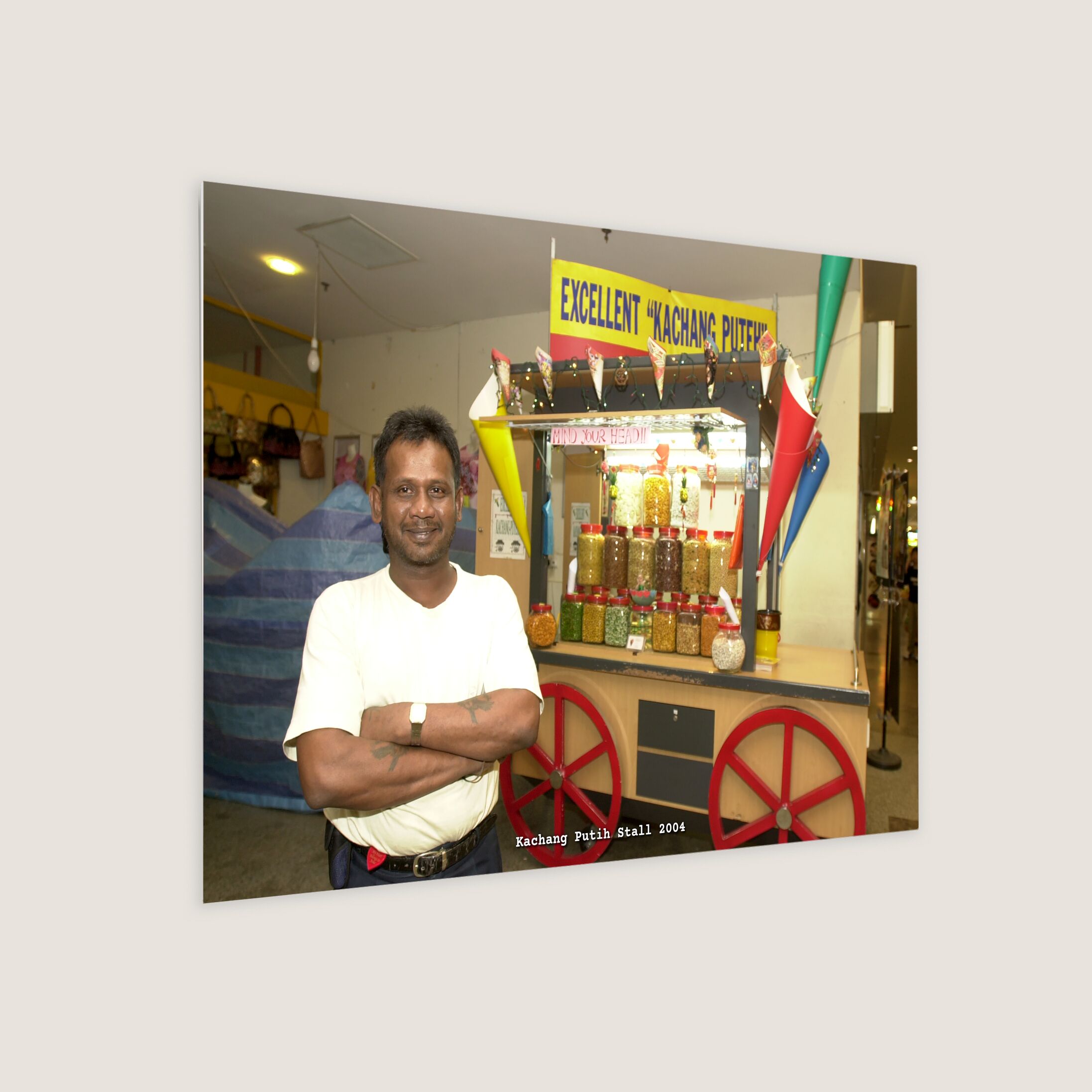 'Kacang putih' is a traditional Malay snack often sold by Indian vendors, consists of roasted or fried nuts and beans, usually served in paper cones. This stall at Turf City displayed the nuts in plastic containers and featured bright lighting. Stalls in the past used to be sell the snacks from a makeshift table or bicycle. Once a common street snack in Singapore, kacang putih stalls have mostly disappeared.