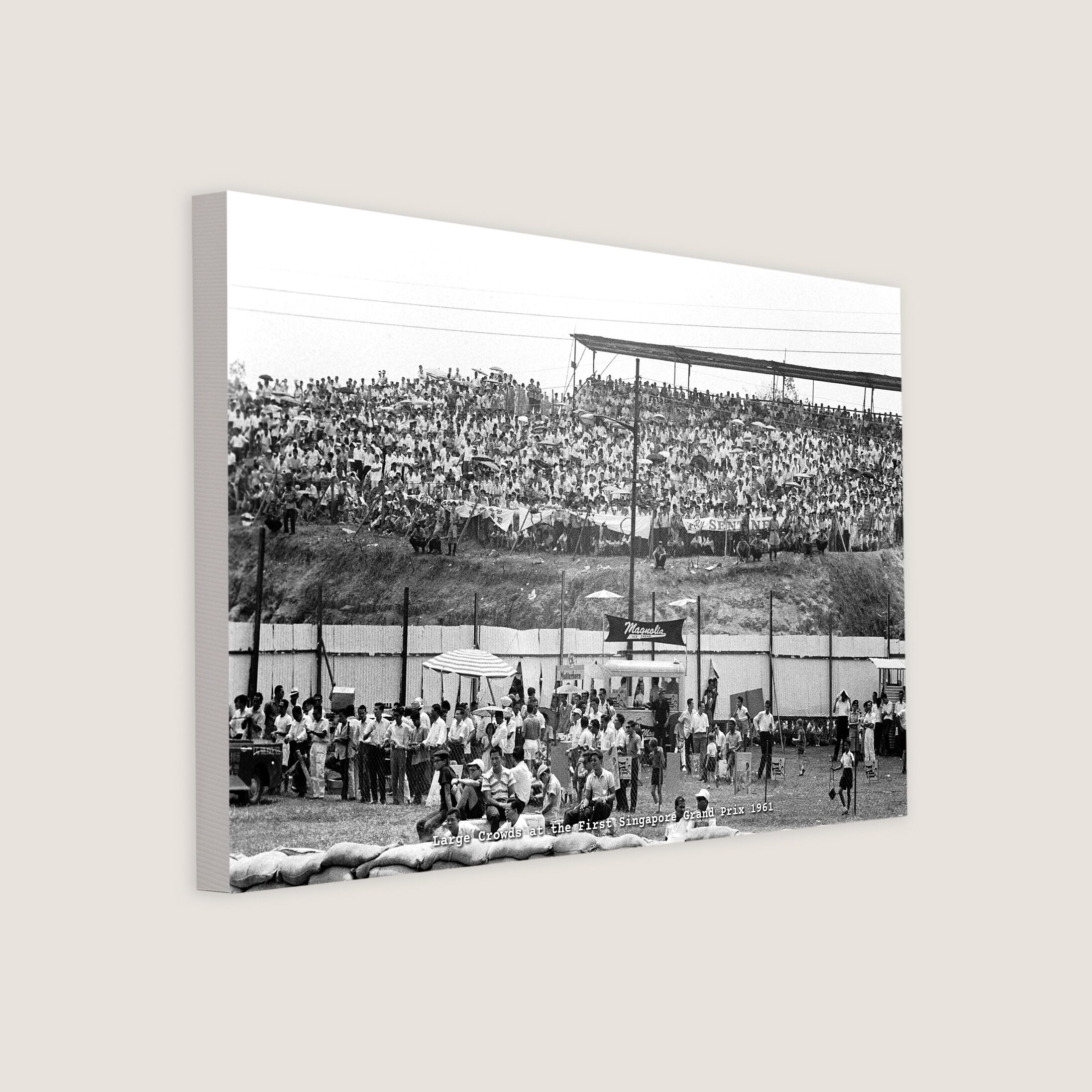 Over 100,000 people showed up to watch the first Grand Prix held in Singapore. The crowds were so overwhelming that ticket sales had to be stopped an hour after the start of the first of the two main races. Police reinforcements were called as hundreds of people who had been denied tickets tried to push their way in. That year, main grandstand tickets cost 9 Malayan Dollars, while general admission was 1 Malayan Dollar.