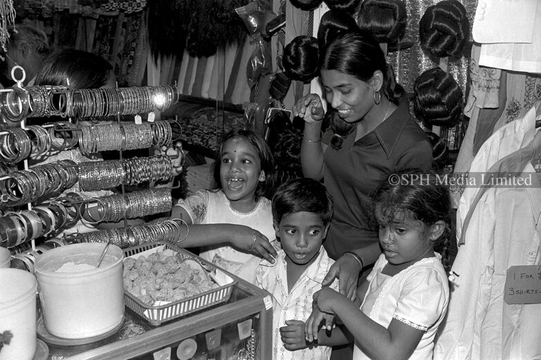 Hindus thronged Serangoon Road for last-minute Deepavali shopping. Popular items included saris, glass bangles, and sweetmeats—traditional confections made with sugar or honey.