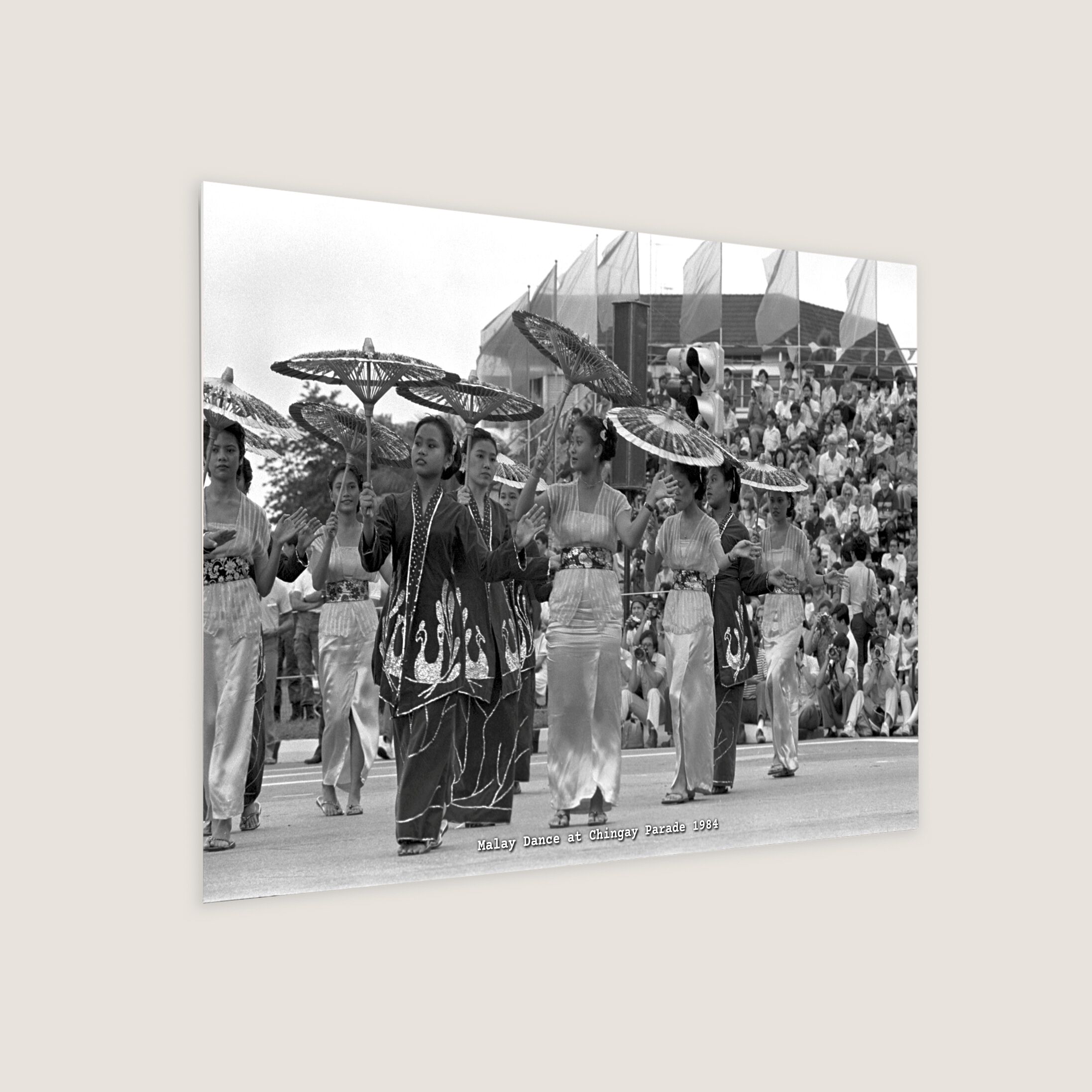 Chingay Parade highlights our multi-cultural society. Girls and young men in multi-hued costumes swayed and twirled their umbrellas, gleaming with tinsel. The Malay umbrella dance was part of the Chingay Parade 1984 at Ang Mo Kio.