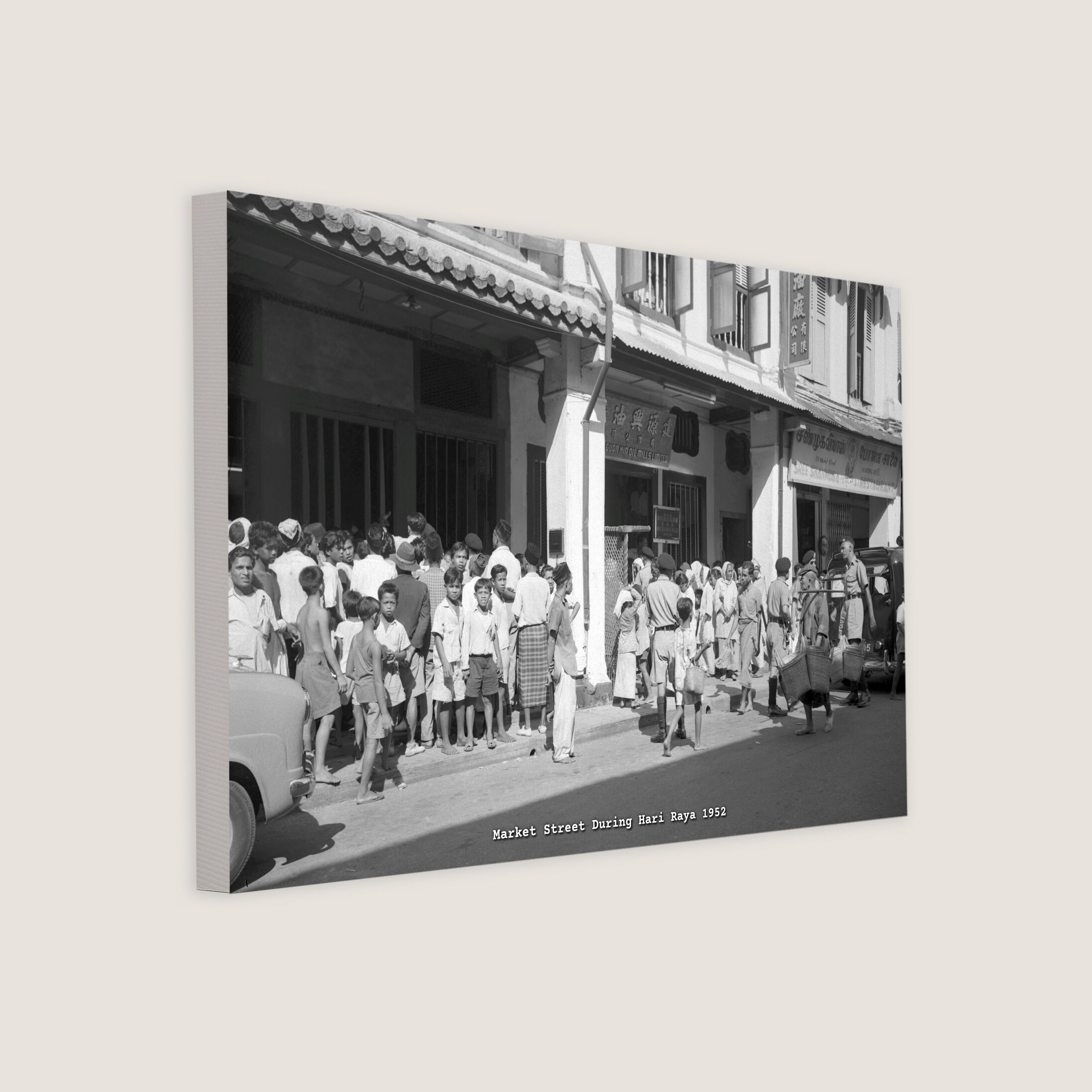 A crowd of people who came from all over Singapore gathered in front of a small shop on Market Street for special Hari Raya gifts. Market Street is considered one of the older streets of Singapore, home to many Indians and Hokkiens.