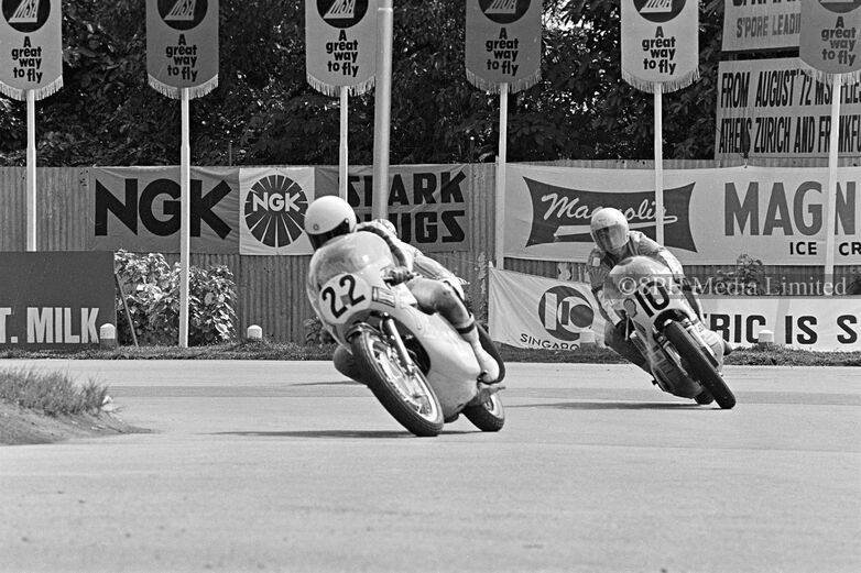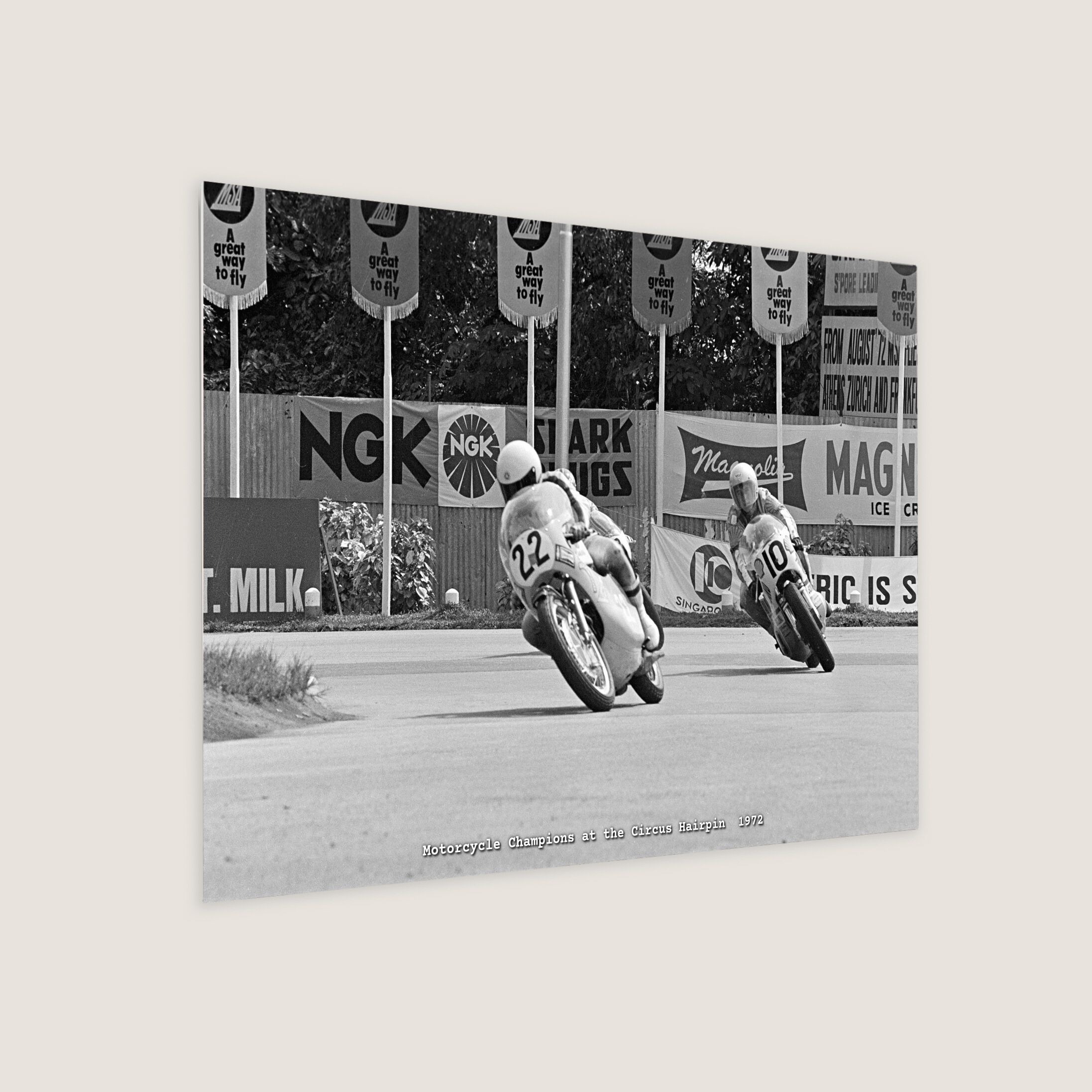 Akiyasu Motohashi (22) and Geoff Perry (10) race around the Circus Hairpin at Sembawang Hills Circus during the 1972 Singapore Grand Prix on the Upper Thomson Road CIrcuit. Yamaha rider Akiyasu Motohashi achieved the most wins on this circuit throughout its history with 4 wins in 1964, 1965, 1967 and 1968. Geoff Perry on his Suzuki bike would go on to win the 1972 and 1973 races.