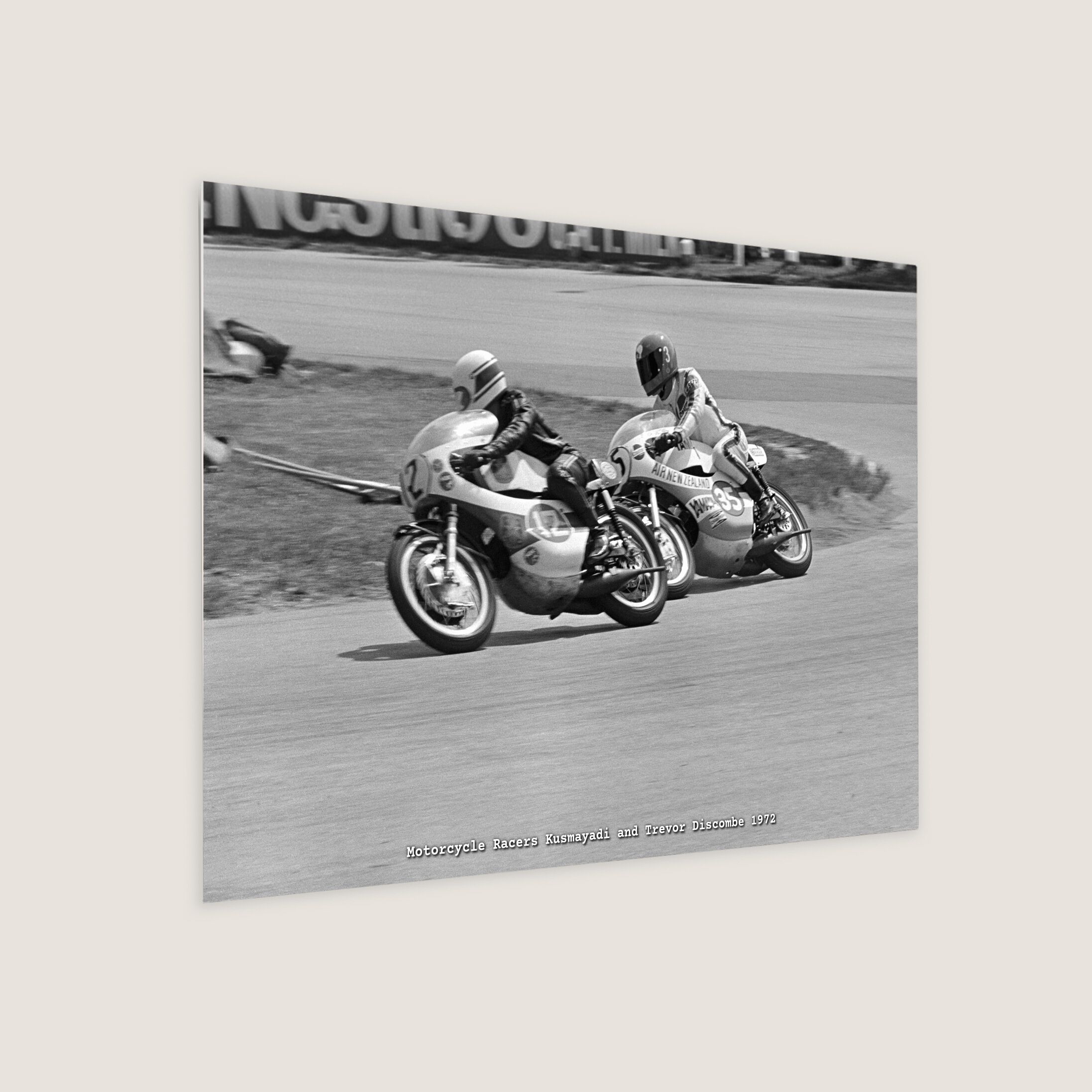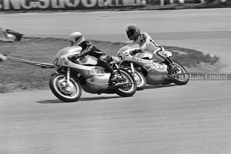 Kusmayadi (12) from Indonesia on a Maico R.S. and Trevor Discombe (35) from New Zealand on a Yamaha at the Circus Hairpin located at Sembawang Hills Circus during the 1972 Singapore Grand Prix on the Upper Thomson Road Circuit.