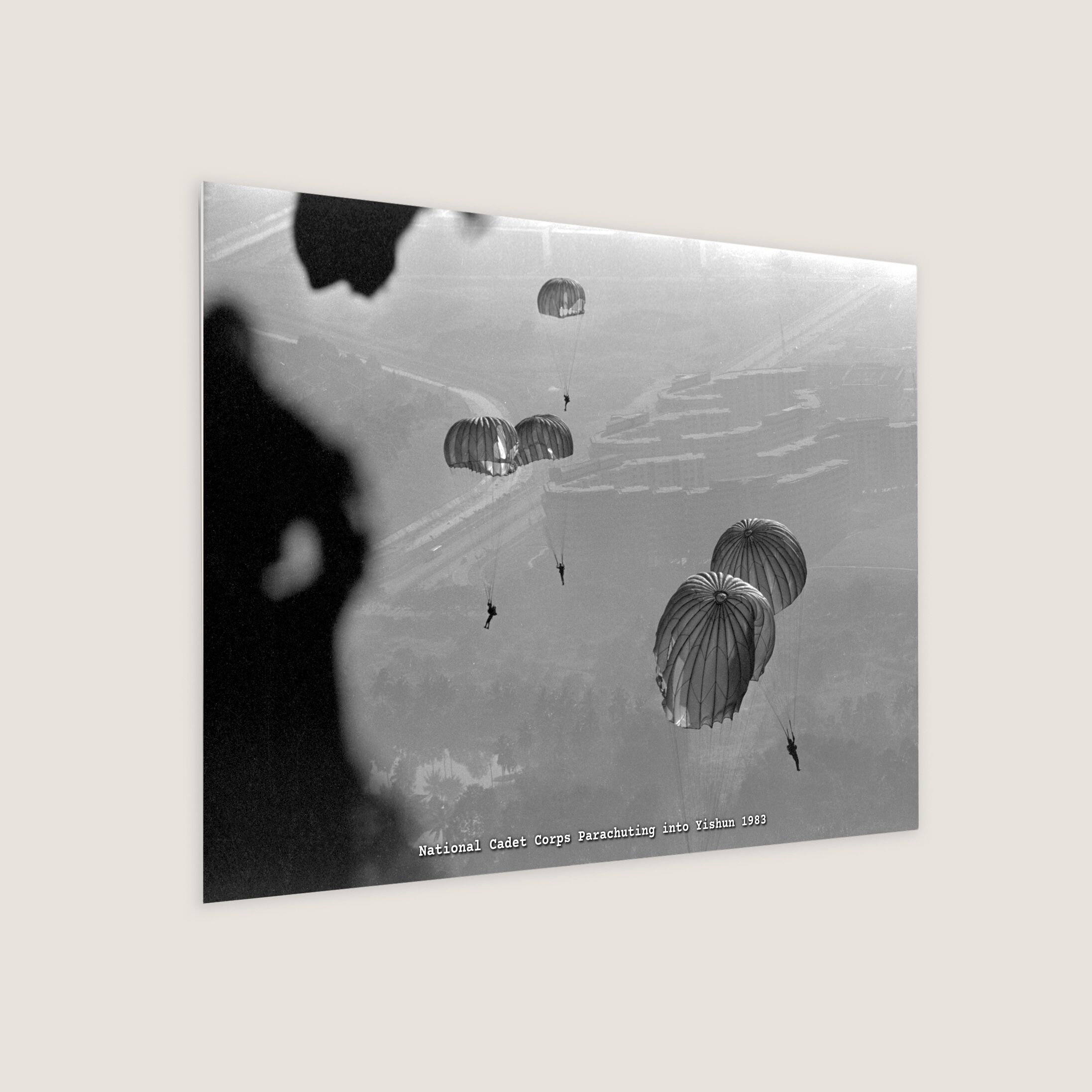 Five cadets of the National Cadet Corps drifted safely down to earth near a HDB estate in Yishun. They were among 54 cadets who were parachuting to earn their wings. The canopies of their parachutes, opened three seconds after they jumped off a Skyvan at 365 metres.