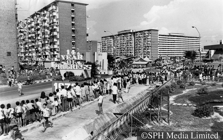 Spectators gathered at the first satellite town* Toa Payoh to watch the procession of 14 People's Association floats on 9 August 1972. It is one of the highlights of the National Day celebrations. *(A satellite town is not only residential but contains an industrial area entertainment facilities and a transportation hub.)