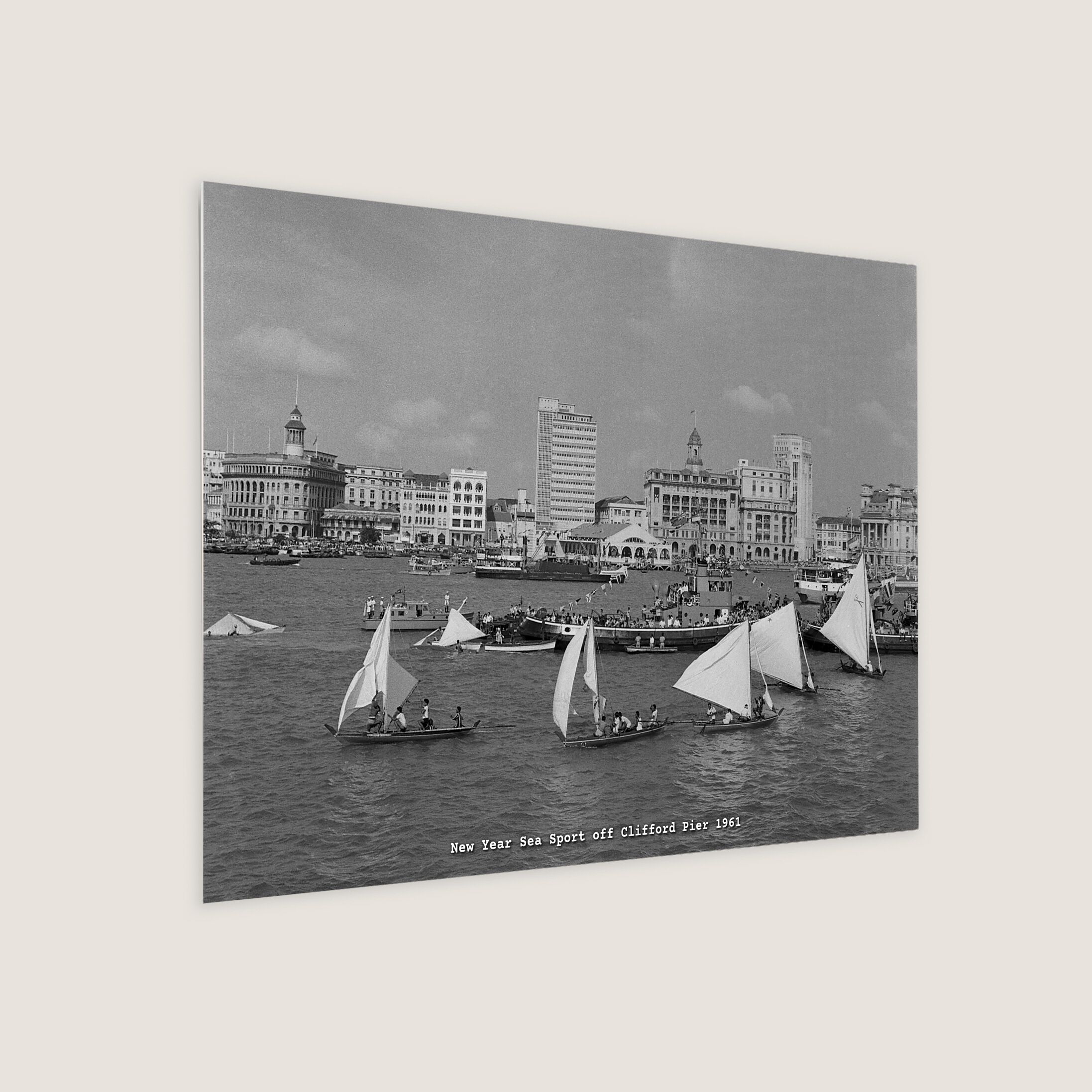 The New Year Sea Sports off Clifford Pier continued a tradition dating back to 1834, when European merchants organised annual regattas featuring races with Malay koleks and other traditional boats. After a hiatus during the Japanese Occupation, the event resumed post-war, drawing large crowds to witness boat races and sea sports. In this photograph, the Ocean Building is visible on the far left, and the General Post Office stands on the extreme right.