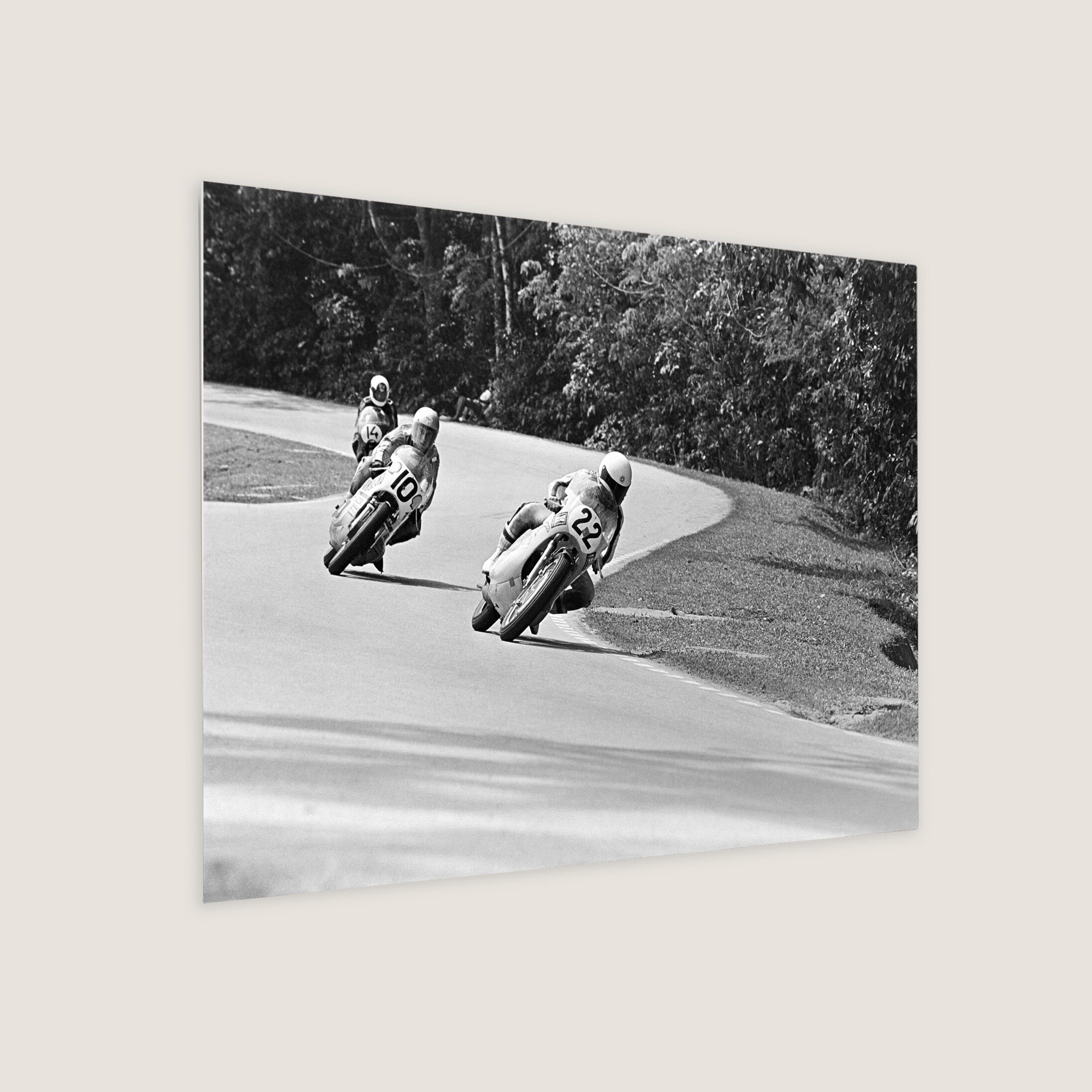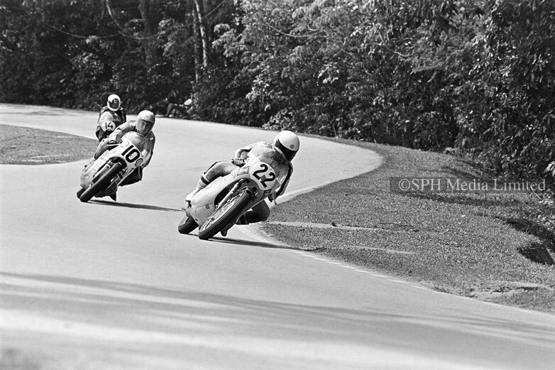 Akiyasu Motohashi (22) and Geoff Perry (10) followed by S. A. Saksono (14) manoeuvre The Snakes on Old Upper Thomson Road during the 1972 Singapore Grand Prix on the Upper Thomson Road Circuit. Yamaha rider Akiyasu Motohashi achieved the most wins on this circuit throughout its history with 4 wins in 1964, 1965, 1967 and 1968. Geoff Perry on his Suzuki bike would go on to win the 1972 and 1973 races.