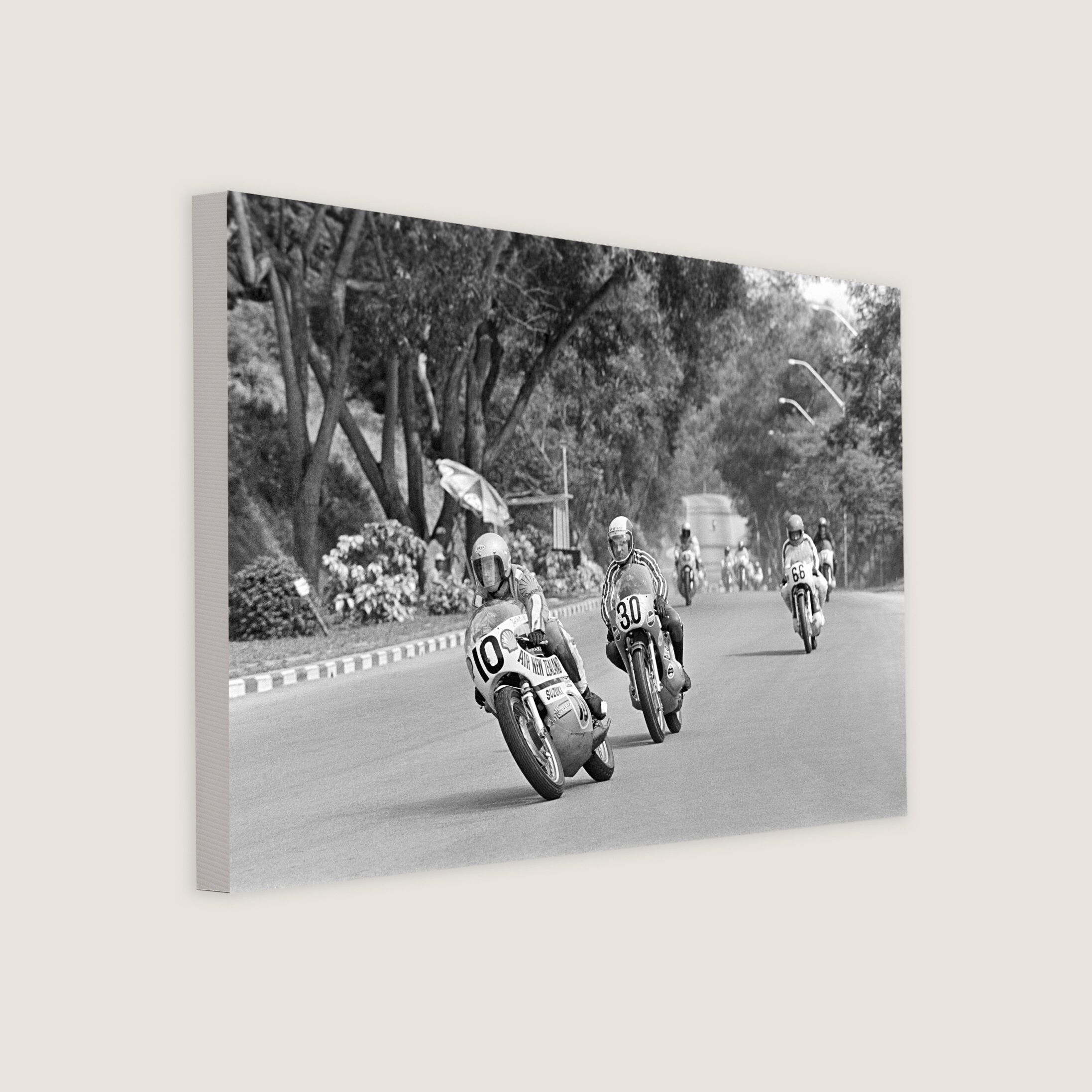 Famous motorcycle racers racing down the Thomson Mile at the 1972 Singapore Grand Prix on the Upper Thomson Road Circuit. Reigning champion Geoff Perry (10) led in his Suzuki, followed by Derek Chatterton (30) in his Chat-Yamaha and Yamaha Team's Y. Oda (66).