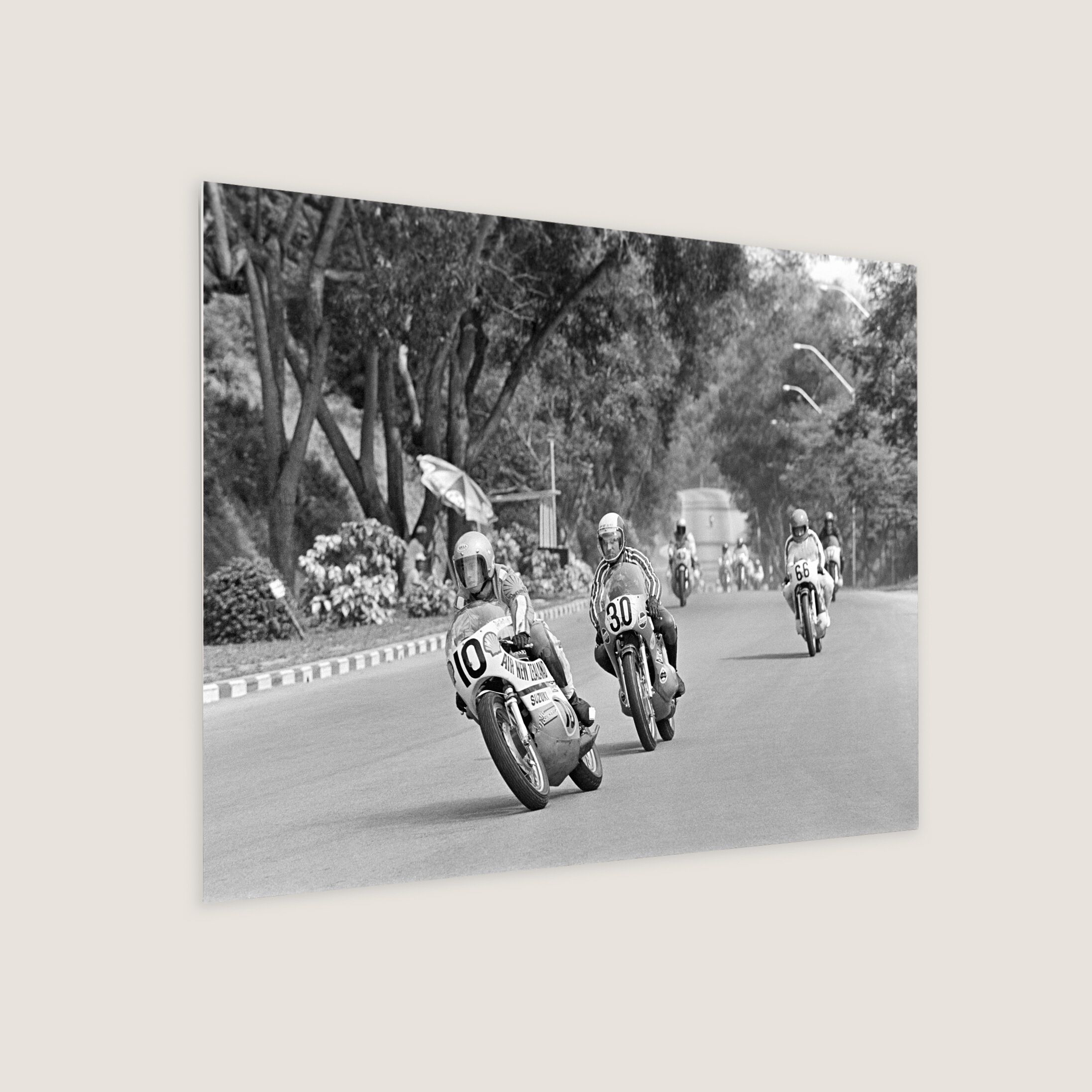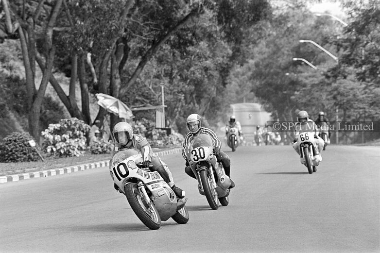 Famous motorcycle racers racing down the Thomson Mile at the 1972 Singapore Grand Prix on the Upper Thomson Road Circuit. Reigning champion Geoff Perry (10) led in his Suzuki, followed by Derek Chatterton (30) in his Chat-Yamaha and Yamaha Team's Y. Oda (66).