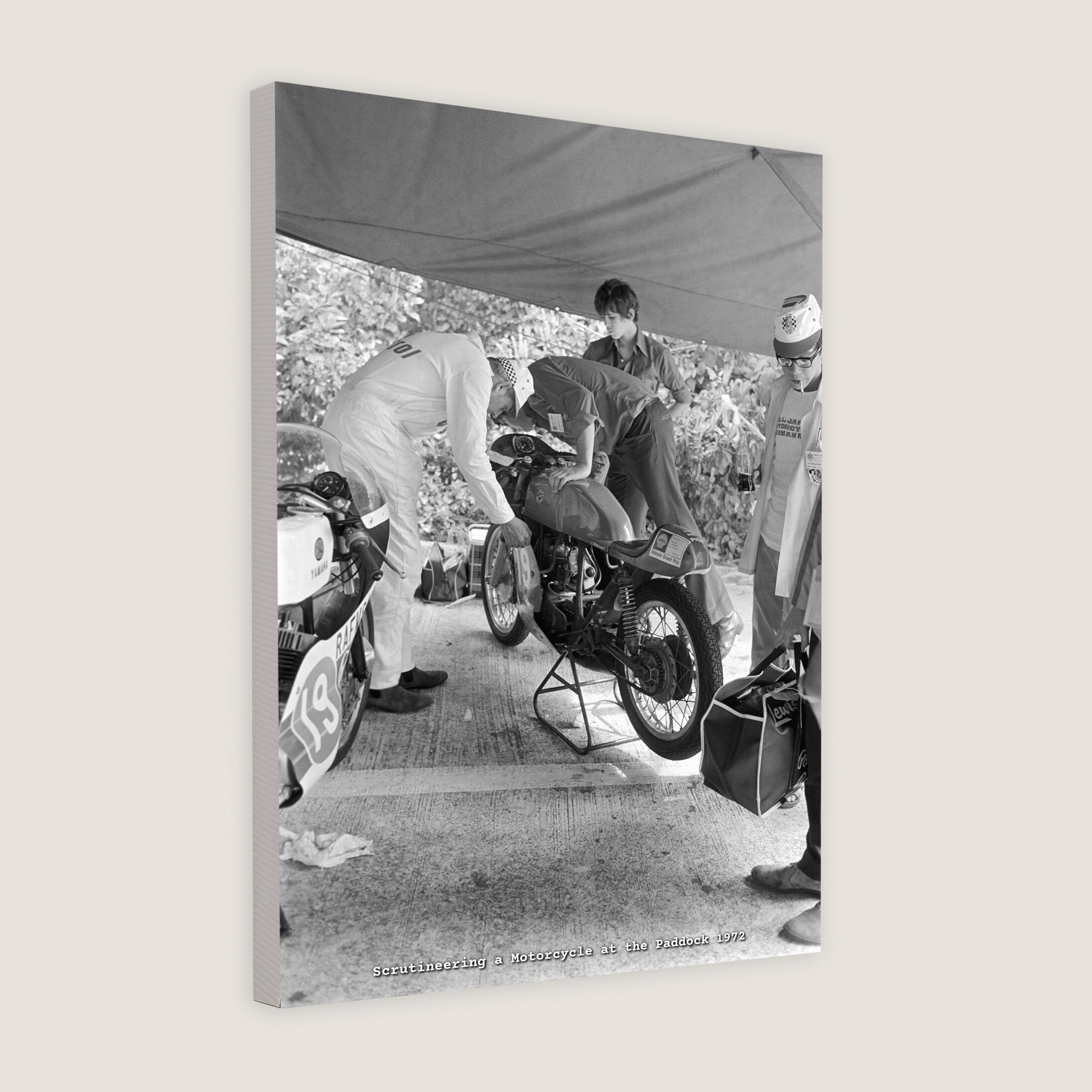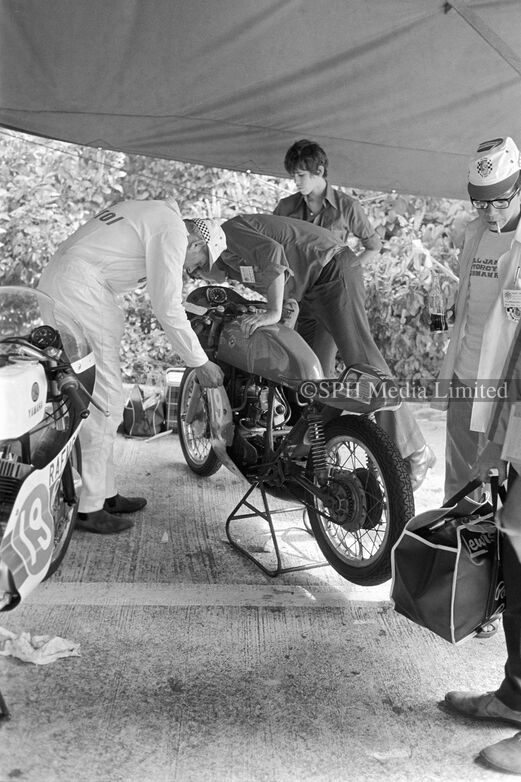 Paddy Reid's Bultaco Motorcycle (19) undergoes scrutineering at the Paddock before the 1972 Grand Prix on the Upper Thomson Road Circuit. Scrutineering was done by race officials to ensure vehicles conformed to the respective race regulations and safety requirements.