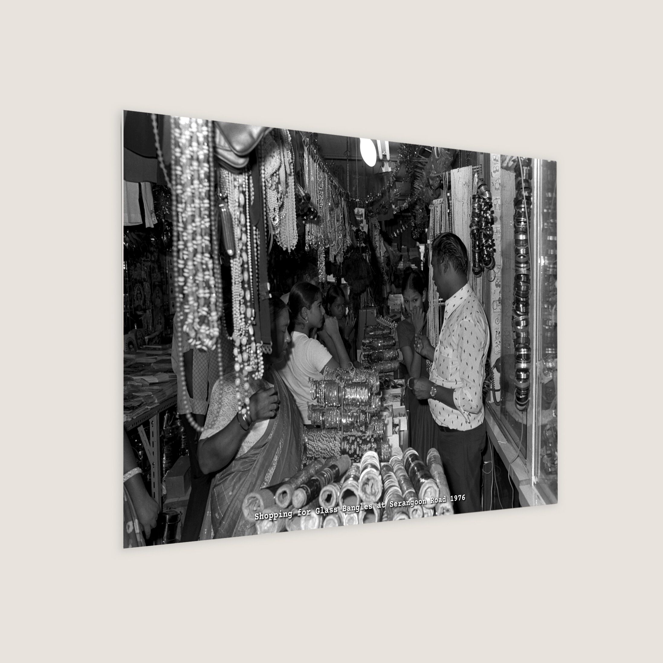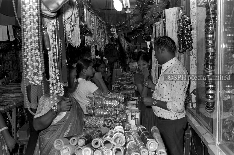 Shops in Serangoon and Tanjong Pagar bustled with activity as Hindus thronged the markets for last-minute Deepavali shopping. This Serangoon Road shop selling glass bangles enjoyed brisk business—these bangles being traditional symbols of auspiciousness.