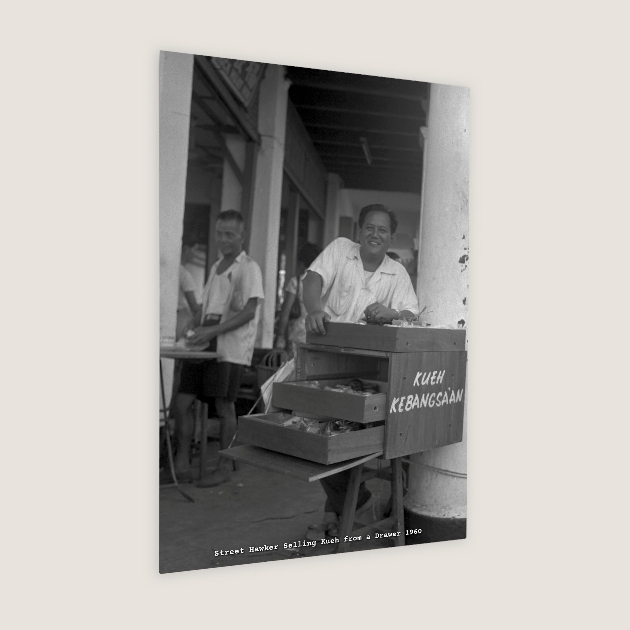 Street hawking was a common livelihood in Singapore, offering low entry barriers. Hawkers used various carriers to transport their goods. In this photo, a 'Kueh Kebangsaan' vendor uses a box with drawers to display his treats, while a mobile pushcart is seen in the background. 'Kueh Kebangsaan' includes traditional snacks like 'kuih seri muka' and 'kuih bangkit'.