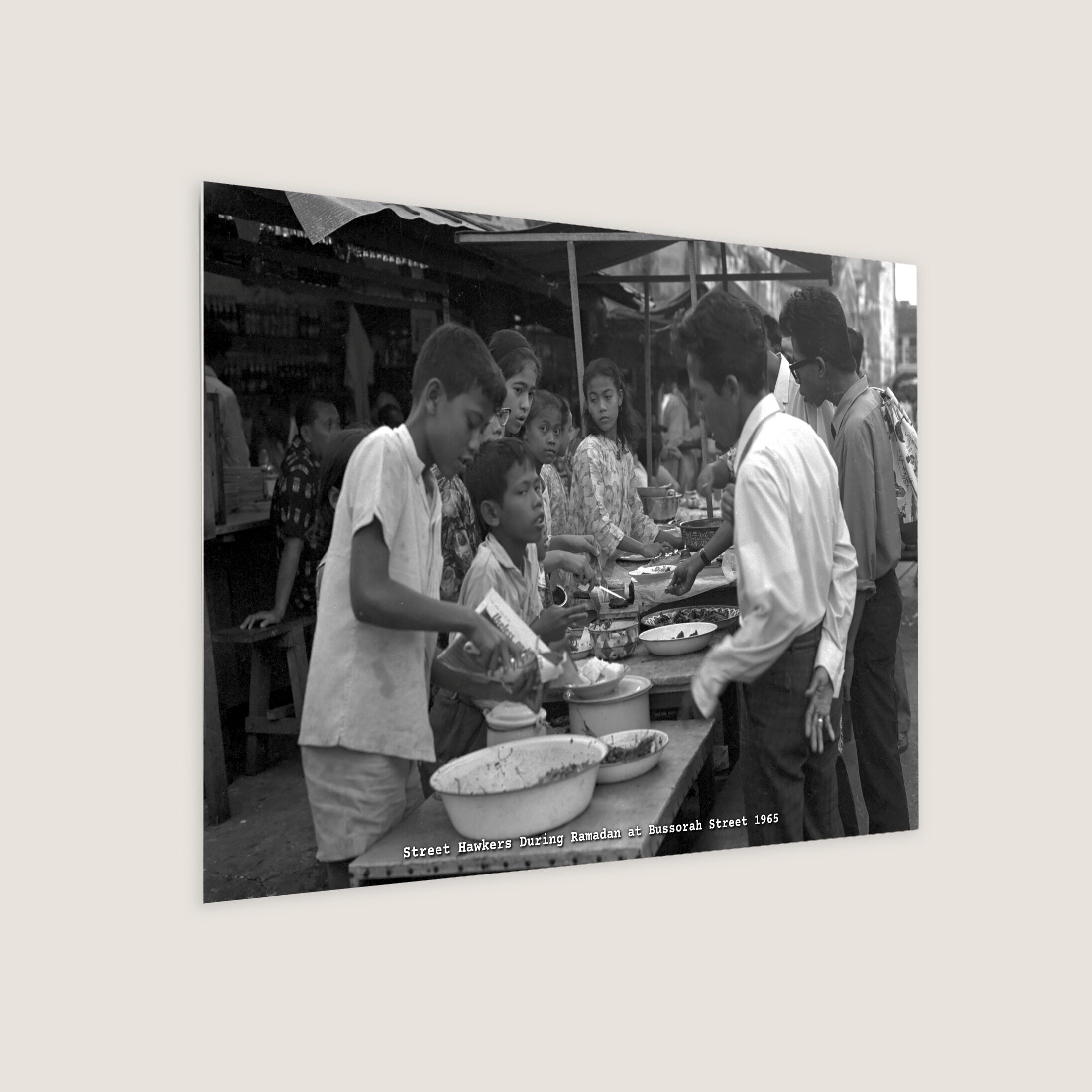 Open-air street hawkers sold confections on Bussorah Street during the fasting month of Ramadan. These stalls were a common sight in Singapore, and the government attempted to regulate them due to concerns about hygiene and traffic congestion. The street hawking trade only saw improvements in regulation from the 1960s to the 1980s, when islandwide checks and registration exercises were enforced.