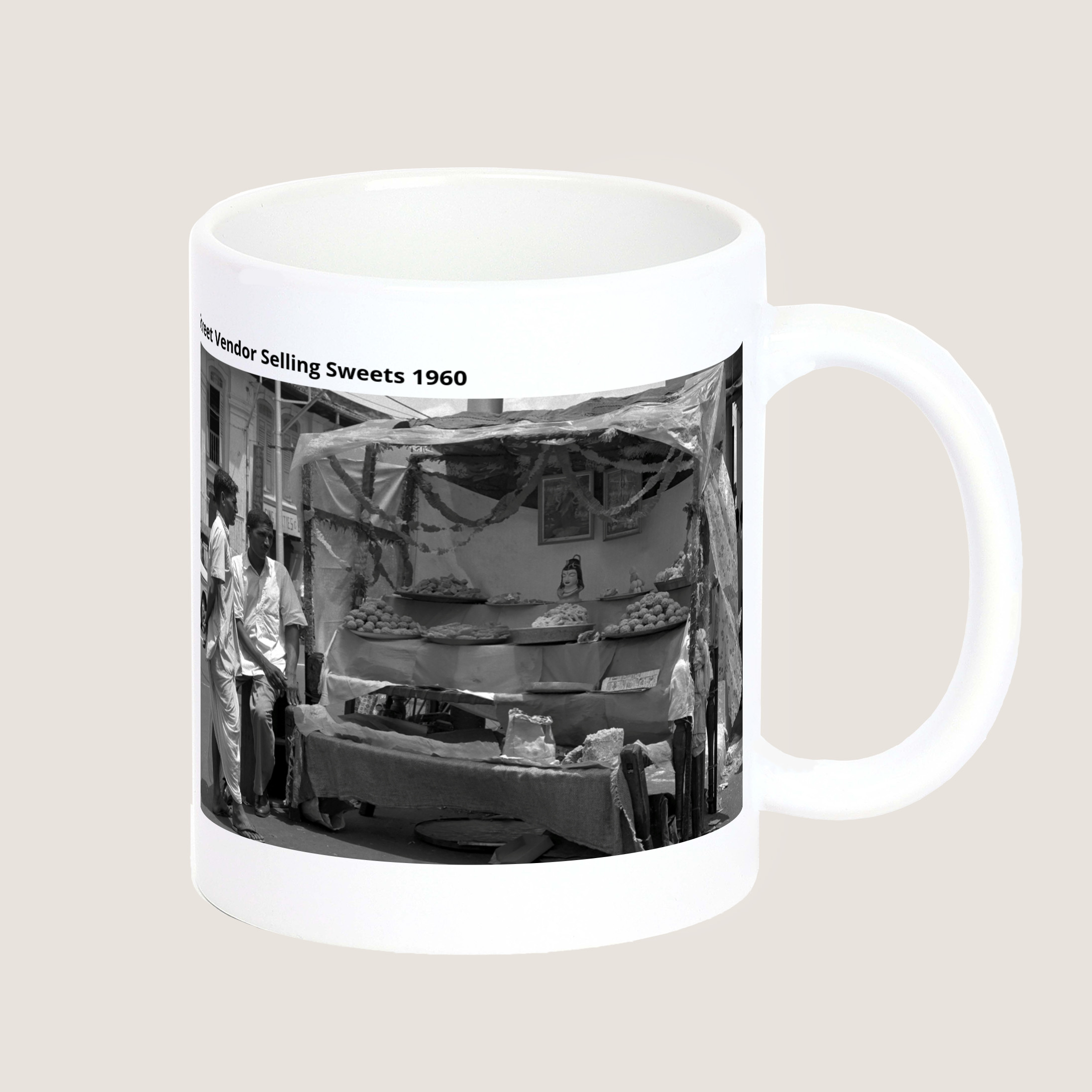 A sweet vendor displays his goods amid Deepavali festive decorations. Mobile sweet vendors were a common sight during the 1950s and 60s, adding charm to the celebrations.