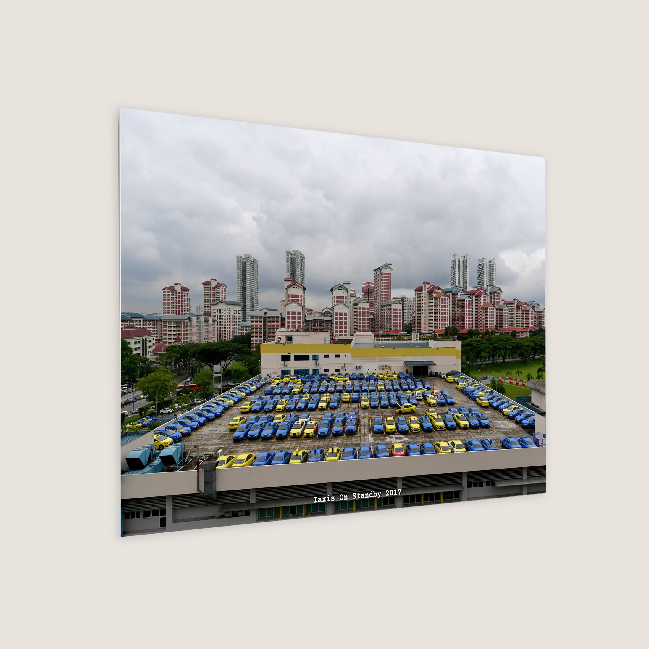 Taxis are parked on the rooftop of the taxi company building on Sin Ming Avenue, with the Bishan Housing Estate as the backdrop.