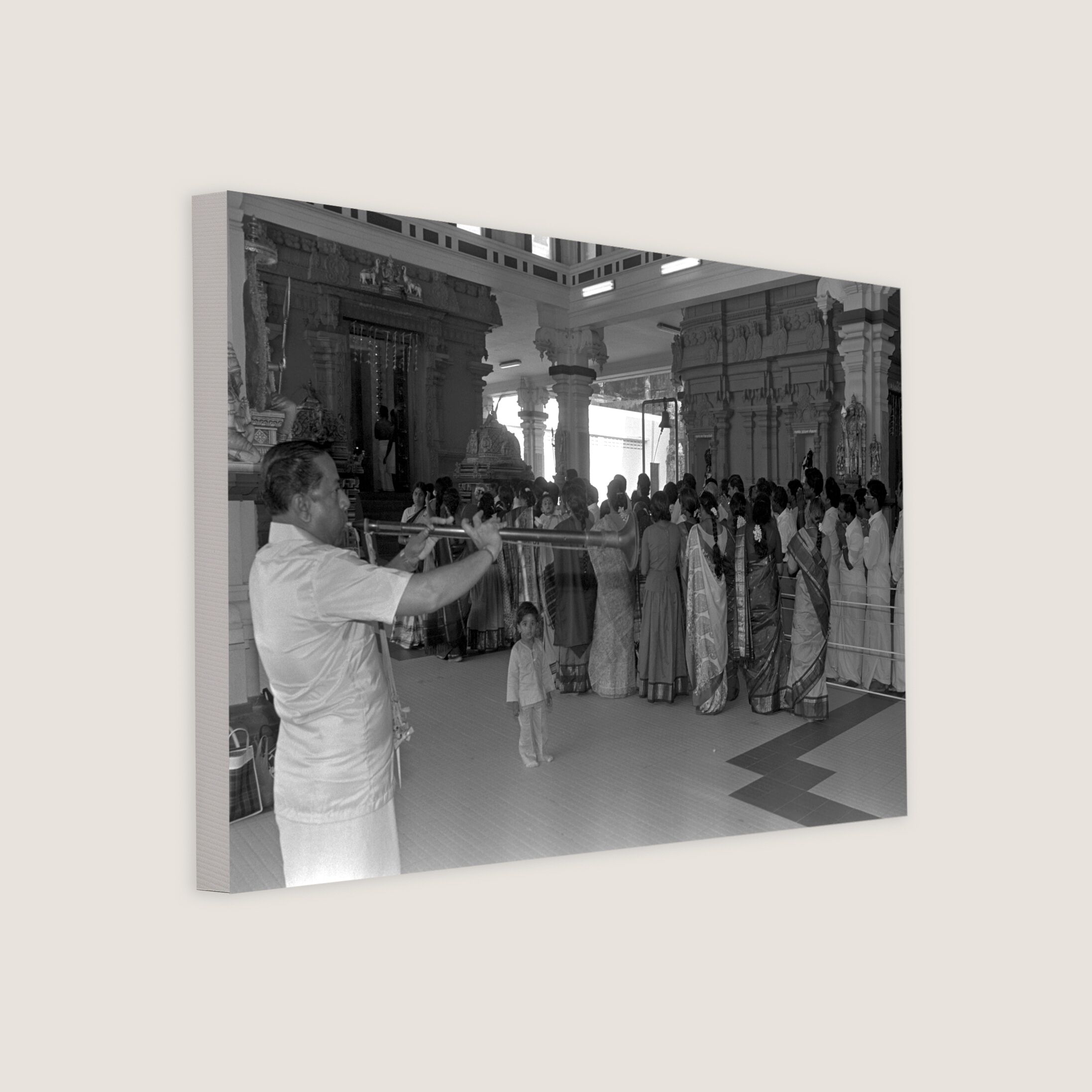 A temple musician plays the nadaswaram, a traditional wind instrument, as devotees gather at Sri Thendayuthapani Temple to offer prayers on Deepavali. Known as the Chettiars’ Temple, this historic site on Tank Road was built in 1859 and gazetted as a national monument in 2014.
