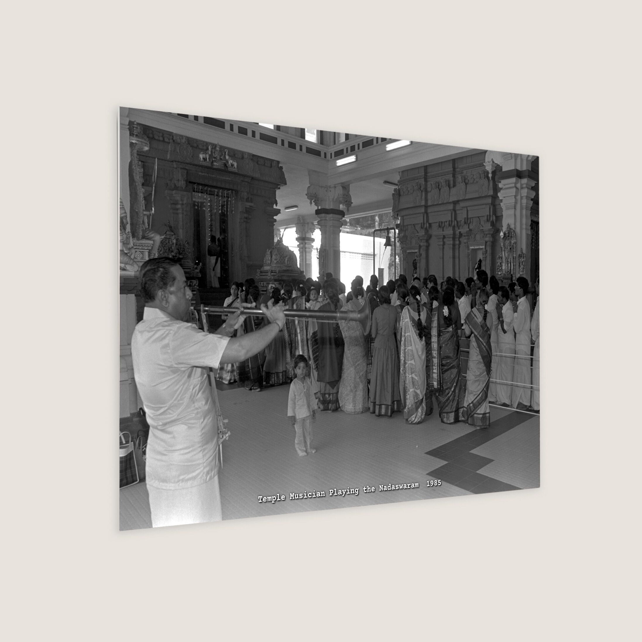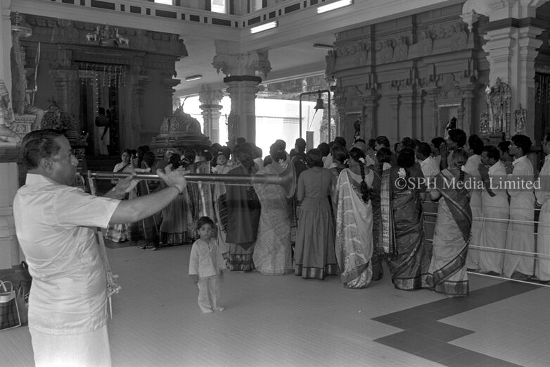 A temple musician plays the nadaswaram, a traditional wind instrument, as devotees gather at Sri Thendayuthapani Temple to offer prayers on Deepavali. Known as the Chettiars’ Temple, this historic site on Tank Road was built in 1859 and gazetted as a national monument in 2014.
