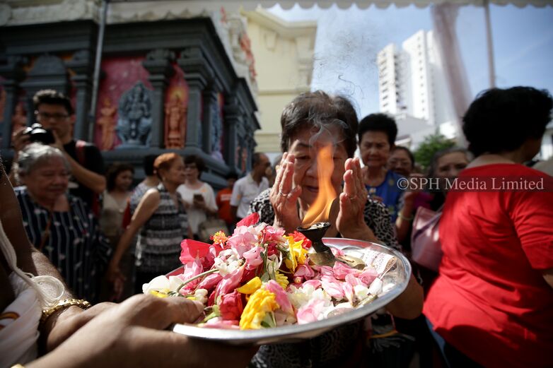Singaporeans of various faiths and races celebrated Deepavali with devotees during a guided tour of the 140-year-old Sri Senpaga Vinayagar Temple. As part of the 'Celebrating our Festivals' series, a platform created to allow Singaporeans of different backgrounds to experience the different major festivals. A participant places her hands near the flame before touching her face, a ritual symbolising the reception of divine blessings. The sacred flame is believed to purify and spiritually uplift.