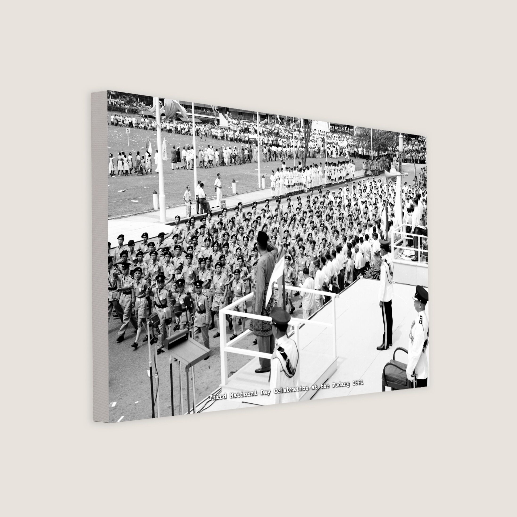 After Singapore became a self-governing state under the British on 3 June 1959, National Day was celebrated in June for a few years during the early 1960s. In this photo, Yang di-Pertuan Negara Yusof Ishak was seen saluting the people's procession. Yusof Ishak became Singapore’s first president on 9 August 1965 when gained independence as a sovereign state.