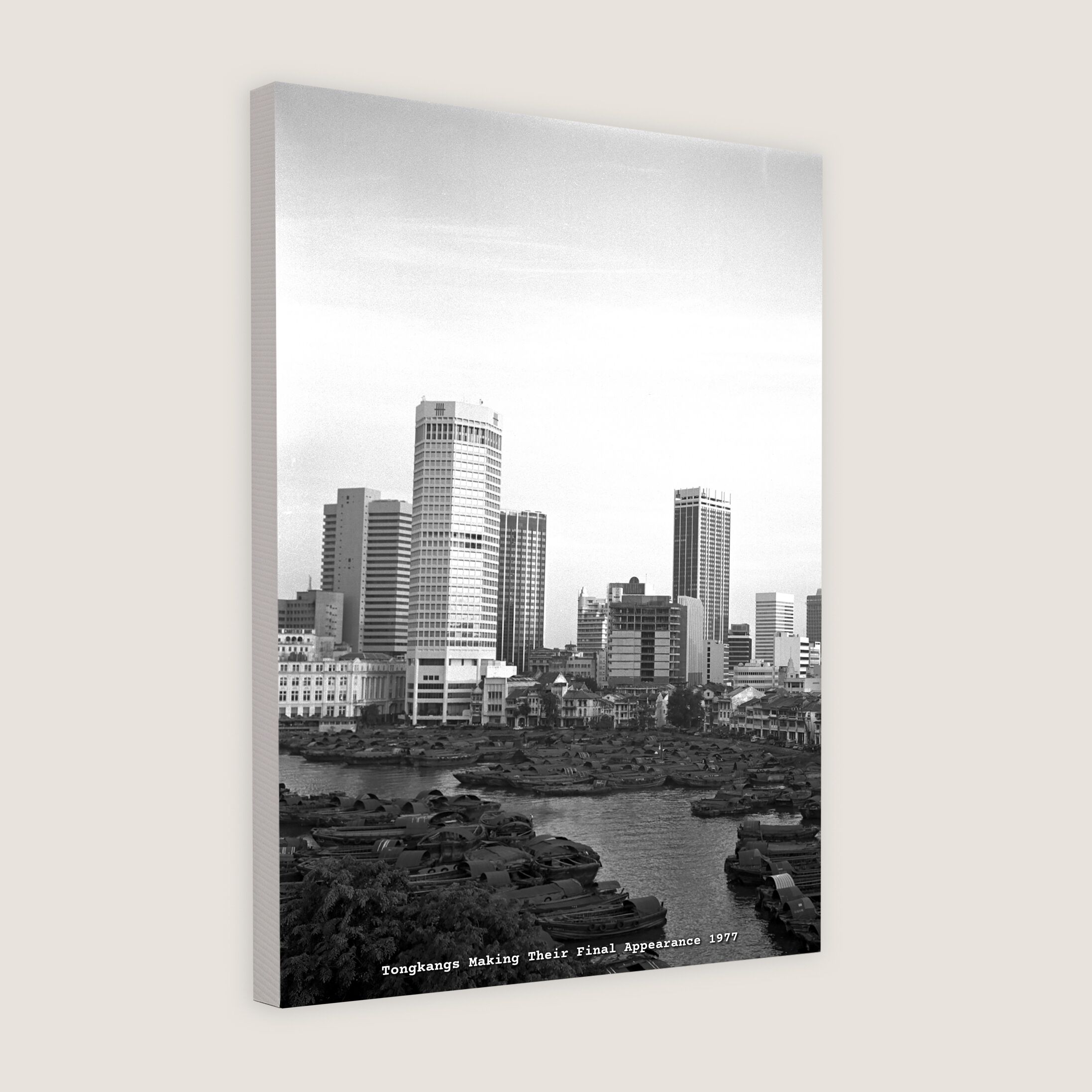 In August 1977, as the Singapore River cleanup commenced, tongkangs were making their final appearance along the waterway, their silhouettes framed by the rising skyline. Once vital to trade, these wooden boats ferried goods from ocean vessels that could not berth ashore, marking an era of bustling river commerce now fading into history.
