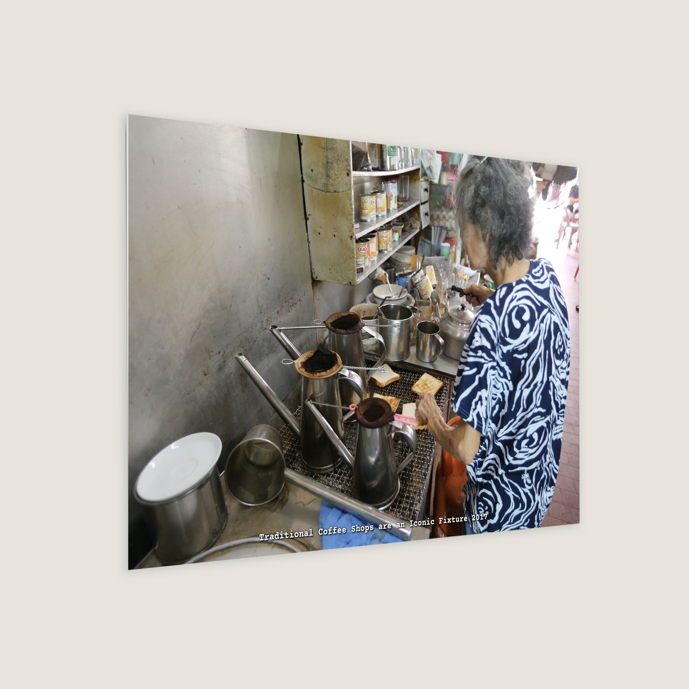 The photo shows a traditional Singapore coffee shop, where the owner prepares kaya toast and brews classic coffee and tea. Once central to local breakfast culture, these old-school establishments faced growing competition from coffee and tea franchise stores and the challenges of aging operators. Nonetheless, they remained iconic fixtures in Singapore’s culinary landscape.