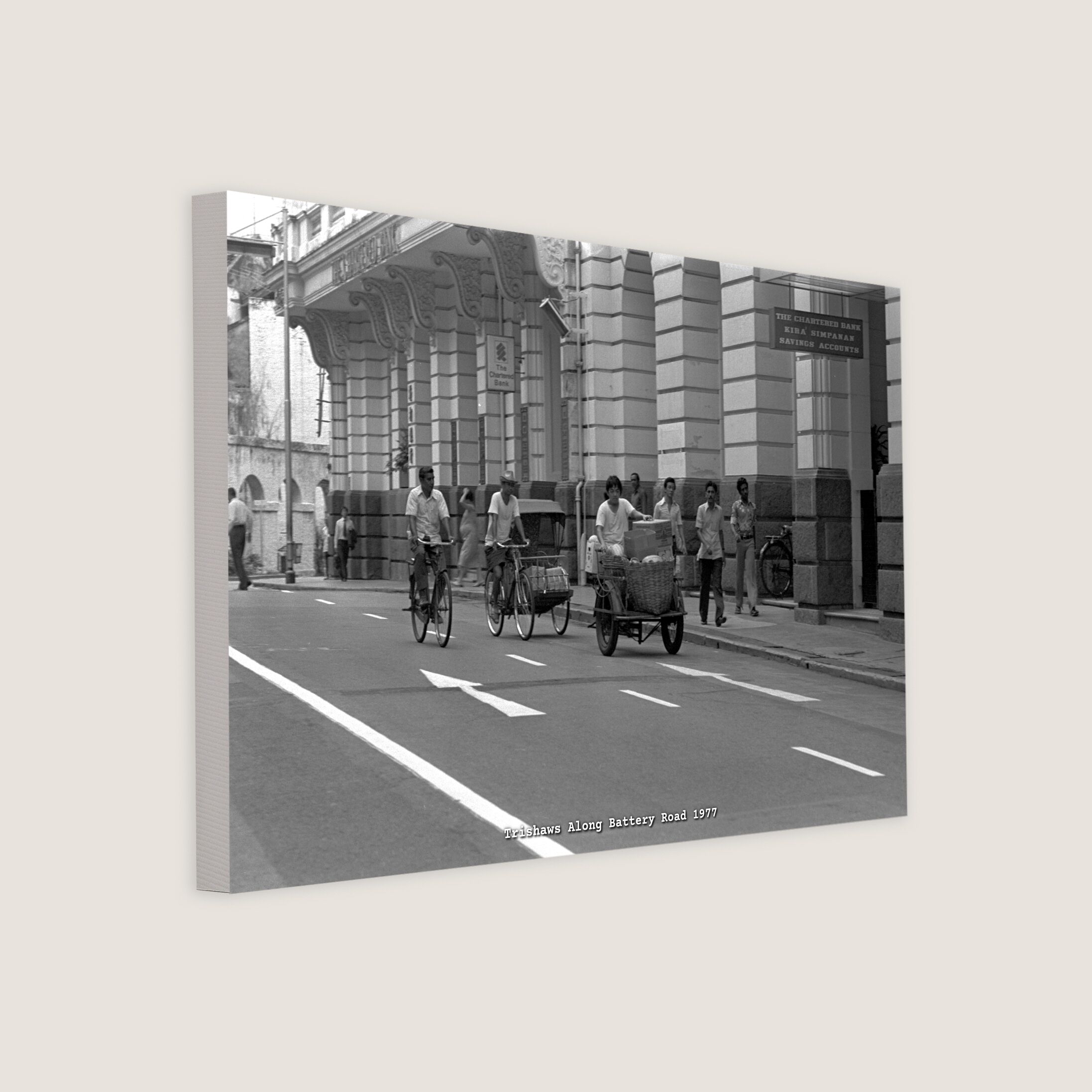 There were several reasons for the decline of the trishaw industry, one of which was the violation of traffic rules, which could endanger other road users. The photo shows trishaw, tricycle, and bicycle riders pedaling along Battery Road against the traffic.