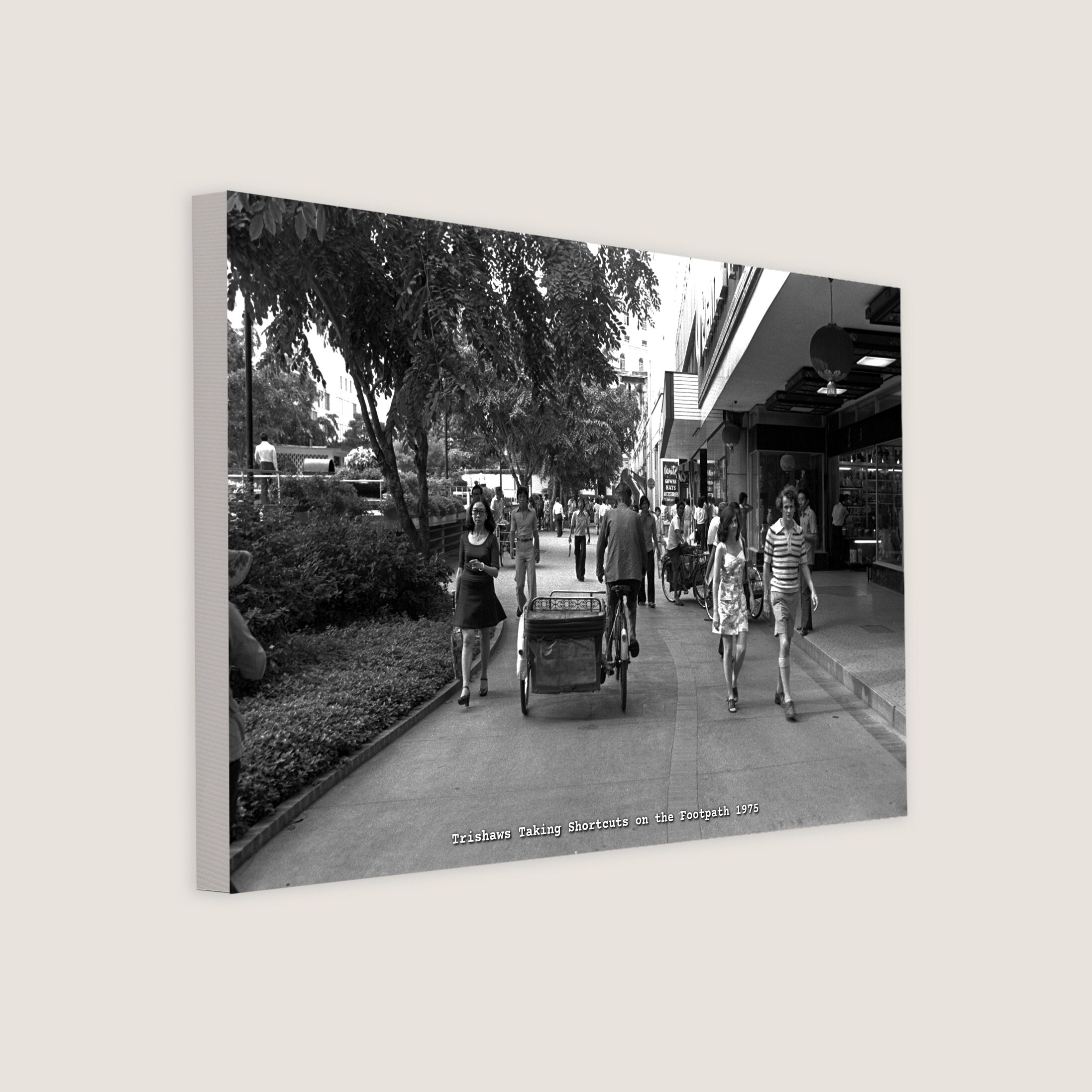 Trishaws on the pedestrian mall at Raffles Place in 1975. In order to maintain an income, trishaw riders pass through the mall as a shortcut or pick-up point for passengers on a daily basis.