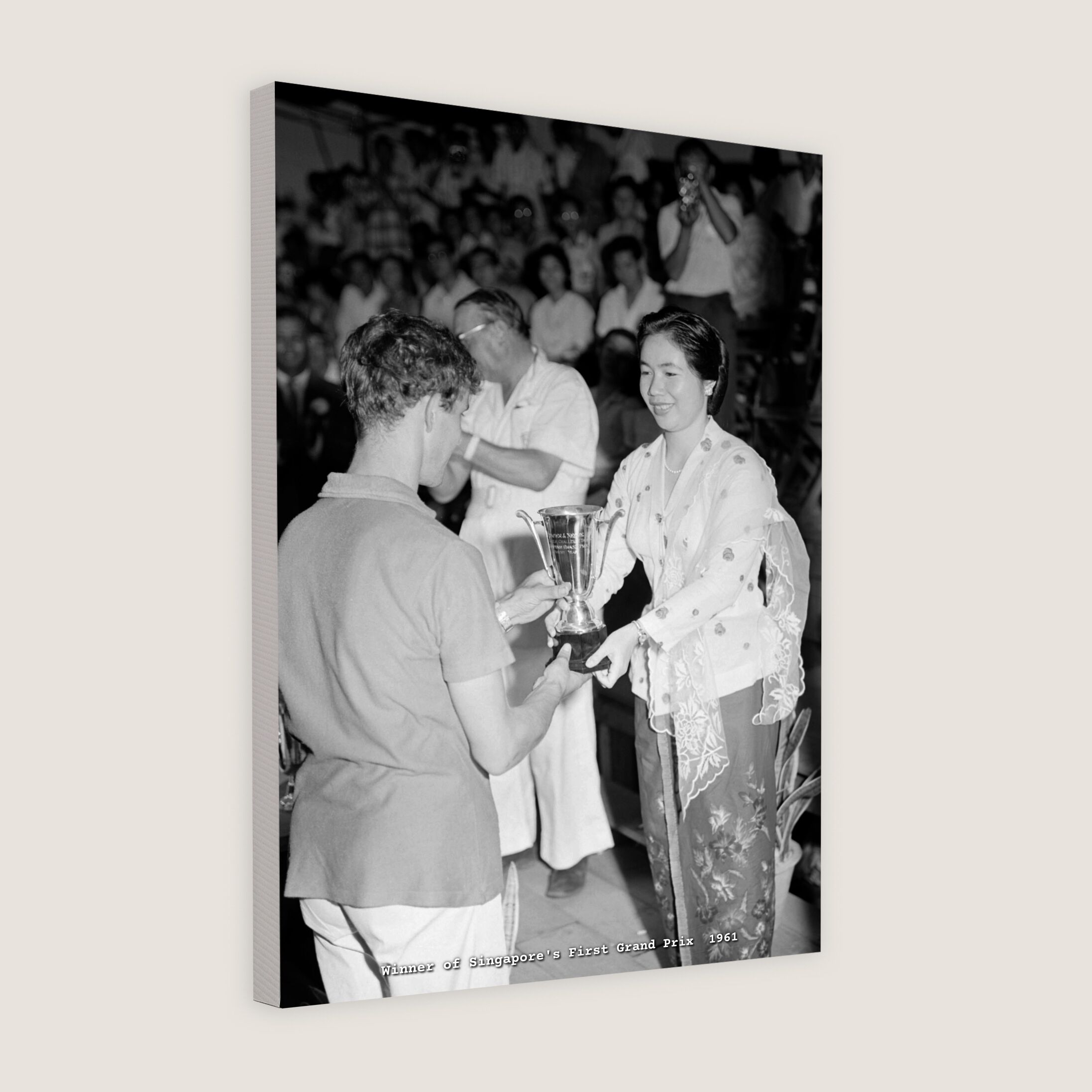 Chris Profitt-White, a Royal Air Force technician won Singapore’s first Grand Prix for Motorcycles in 1961. He rode a Honda 4 and completed 60 laps (180 miles) in 2 hours, 59 minutes, and 43.5 seconds. The gold trophy was presented to him by Puan Noor Aishah, the First Lady and wife of Yusof Ishak.