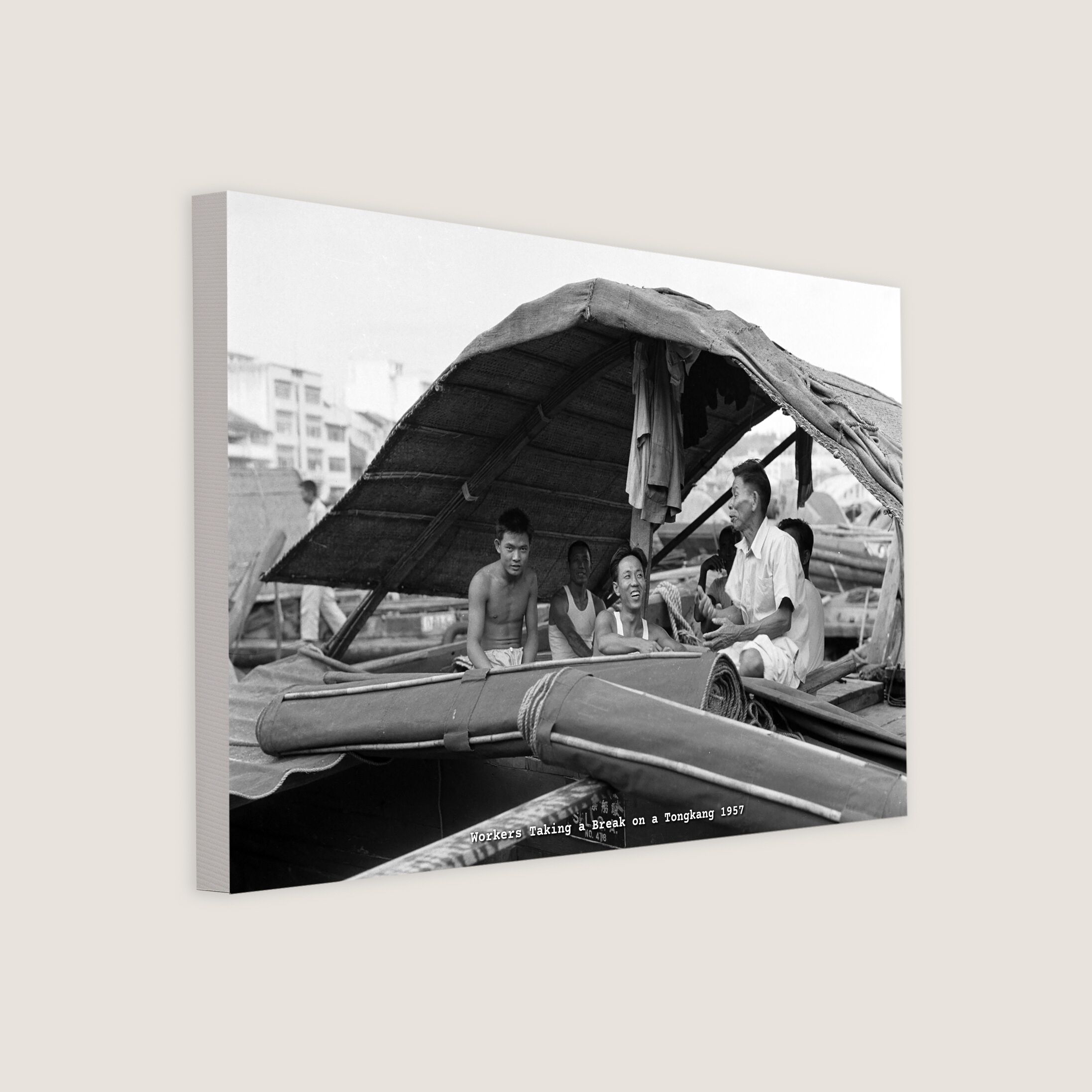 Tongkang means bumboat in Malay. These trades created many job opportunities and were the link between ships anchored out at sea and warehouses built along the riverbanks. Workers taking a break on a tongkang include boatmen, cargo handlers, warehouse clerks and more.